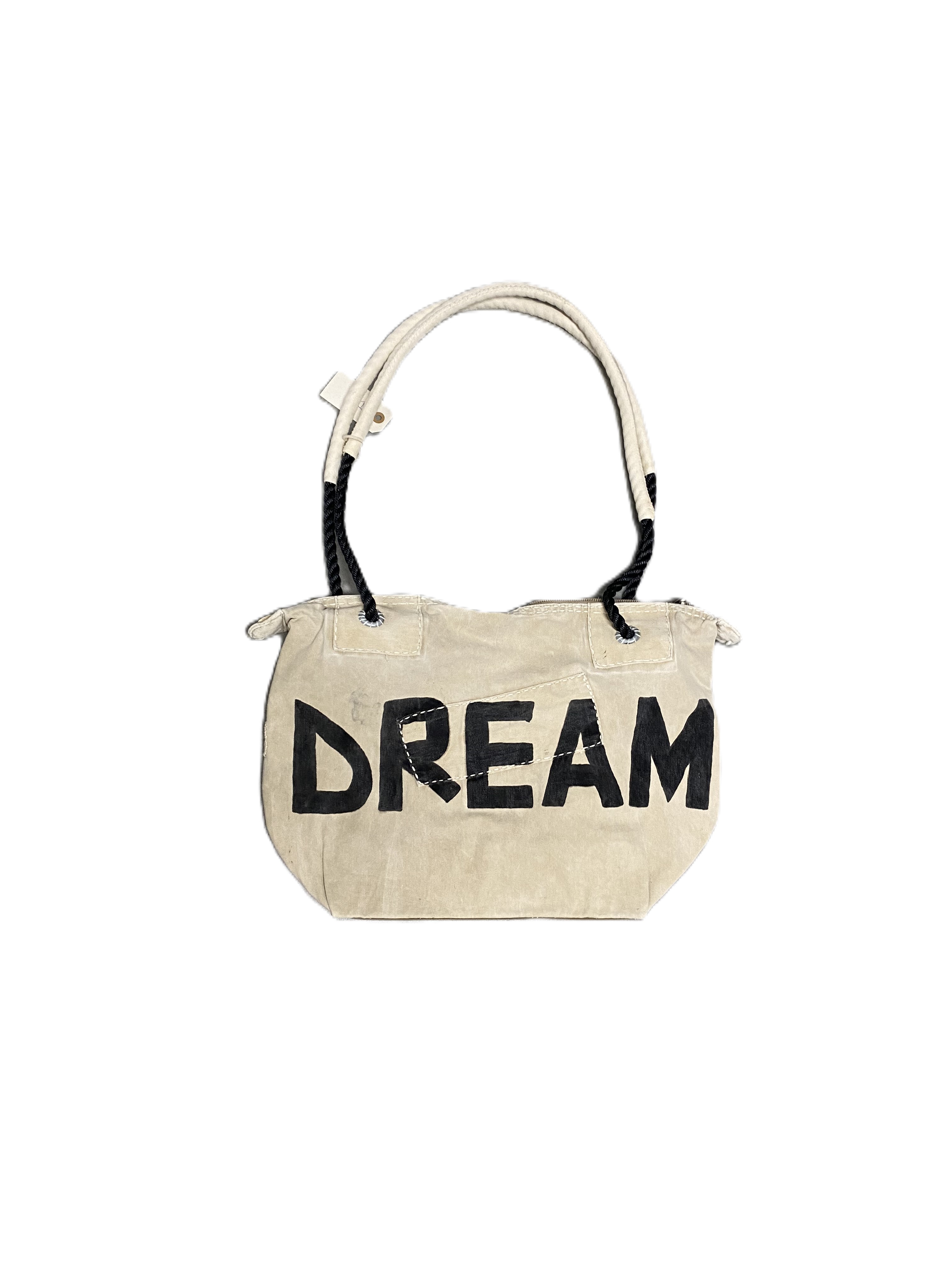 Denna väska är tillverkad av återvunnen segelduk. Den är dekorerad med ett mönster i schablonteknik och det uttjänta seglet är reparerat och lappat med lappteknik där det behövs. Varje väska är unik, både i färgen och på grund av lappningen.