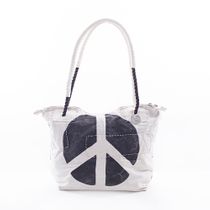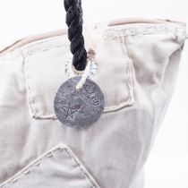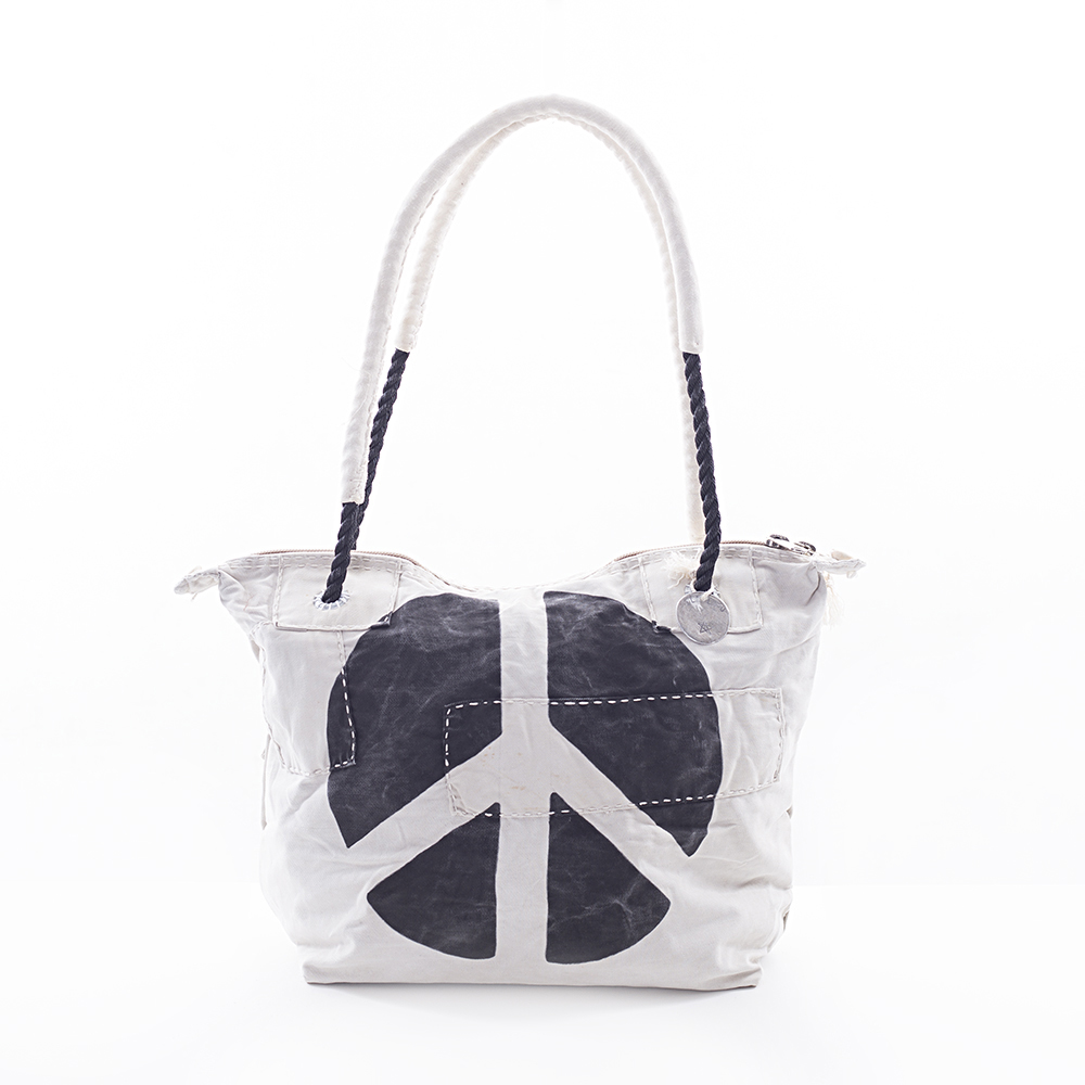 Denna väska är tillverkad av återvunnen segelduk. Den är dekorerad med ett mönster i schablonteknik och det uttjänta seglet är reparerat och lappat med lappteknik där det behövs. Varje väska är unik, både i färgen och på grund av lappningen.
