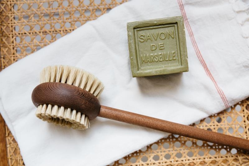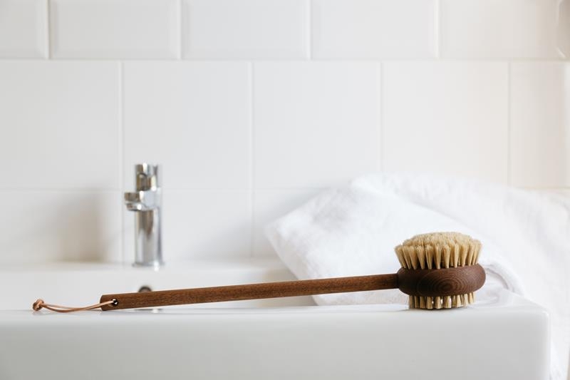 Ryggborste Askträ Artikelnummer: AJ 7031 Ryggborste i naturmaterial och värmebehandlad ask, handtillverkad i Frankrike Denna ryggborste med ett långt handtag når perfekt alla kroppsdelar. Ryggborsten är tillverkad av naturlig ask och borst och har två sidor. En sida med långa fibrer för en mjukare massage av huden och en sida med kortare och styvare fibrer för att rengöra på djupet. Du kan använda borsten för både torr och våt kroppsborstning och för att stimulera, djuprengöra och ta bort döda celler. Alla sätt kommer få din hud att omedelbart kännas mjukare och förberedd för att smörjas med en närande kroppslotion. Denna modell är tillverkad i ask som är behandlat i värme och med vattenånga men utan kemikalier. Det ger träet en fin chokladbrun färg och gör det beständigt mot vatten och fukt och lämplig att använda i ett badrum. • Material trä: Värmebehandlad ask från hållbart skogsbruk i Frankrike• Material fibrer: Vit borst• Storlek: Handtag 33 cm - Borsthuvud Ø 9cm - Total längd ca 43 cm• Tillverkad i Frankrike Ta hand om din borste genom att skölja den och kraftigt skaka av överflödigt vatten efter användning. Låt alltid borsten torka helt och hållet mellan användningarna. Låt den inte stå kvar i vatten. Eftersom den är gjord av naturligt trämaterial som används med vatten kan utseendet ändras efter ett tag. För att njuta av din borste så länge som möjligt rekommenderar vi att du då och då behandlar träet med någon form av matolja.